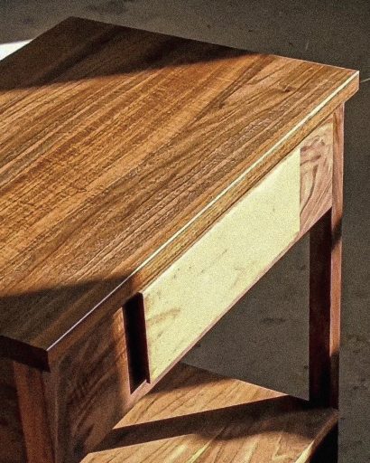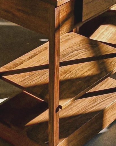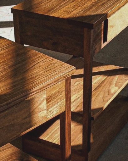 Ces deux dessertes ont été fabriquées à partir d’un noyer qui s’est révélé être particulièrement magnifique : ses contrastes et ses veinages marqués se trouvent sublimés par des parties ondées, visibles sur la vidéo, reflétant la lumière d’une manière toute particulière, créant des motifs et des effets de relief sur les pièces.