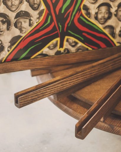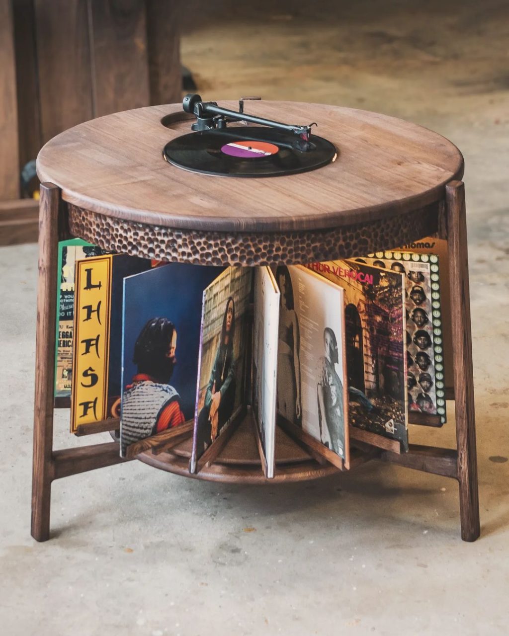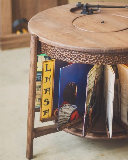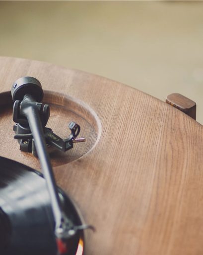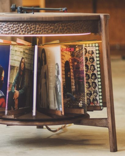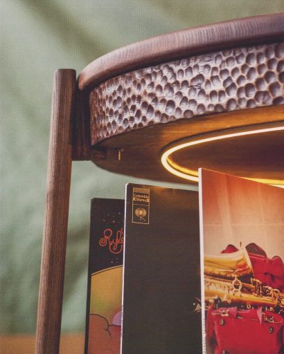 Sa forme ronde et ses plateaux tournants invitent à l’échange, la discussion et la découverte autour d’un disque ou d’une collection.