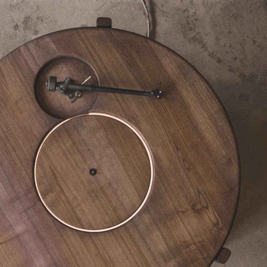 Gros plan sur la partie supérieure de la table d’écoute. Fabriquée en frêne massif, elle est composée de deux pièces, deux cercles concentriques dont l’extérieur est fixe et l’intérieur sert de plateau tournant à la platine, cachée en dessous.