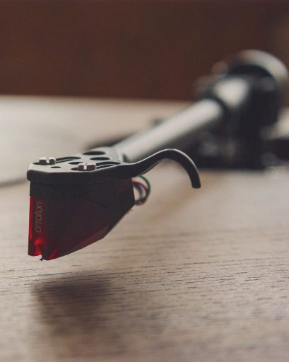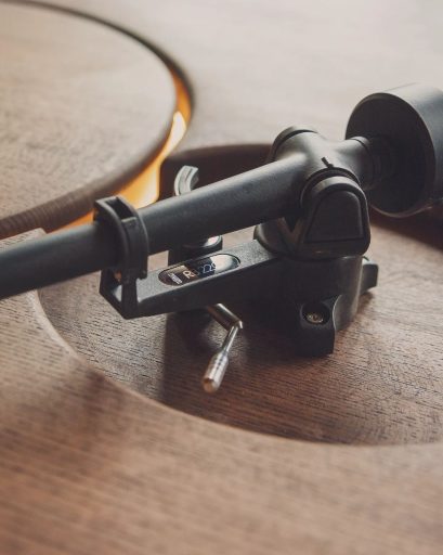 La table intègre une platine Rega Planar 2 et son bras aluminium RB220 équipé d’une cellule Ortofon 2M Red. Le plateau en verre a été remplacé par un plateau fabriqué sur mesure du même bois que le reste de la table. La feutrine a été remplacée par un plateau acrylique hi-fi Fluance, antivibrations et antistatique, qui permet de laisser apparaître les veinages du bois en transparence tout en améliorant les performances d’écoute.