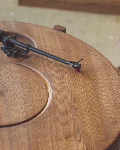 Inventé, conçu et fabriqué à l’atelier, ce meuble hifi pour mélomane et amateur de disques vinyles intègre une platine Rega Planar 2 cachée sous son plateau, ainsi qu’un tourniquet à disques pouvant contenir jusqu’à 18 vinyles.