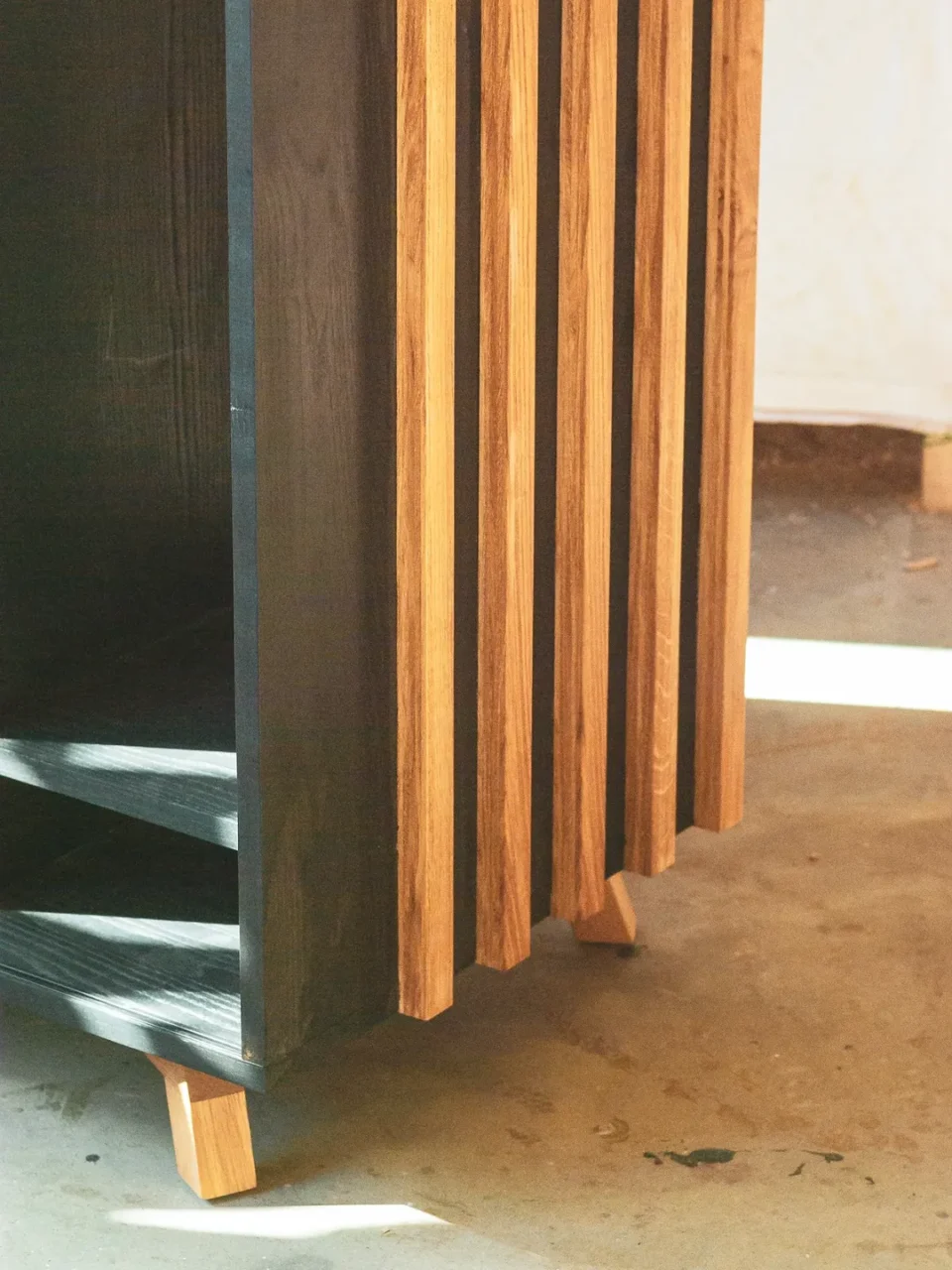 Ainsi allégé, le meuble s’intègre de façon subtile dans l’espace, malgré sa taille et le volume important qu’il occupe. Les arcs en chêne massif répondent au claustras qui habillent les murs du salon et le corps du meuble s’efface dans l’obscurité grâce à sa teinte noire très légèrement satinée.