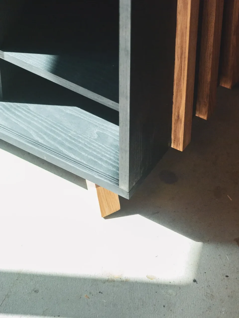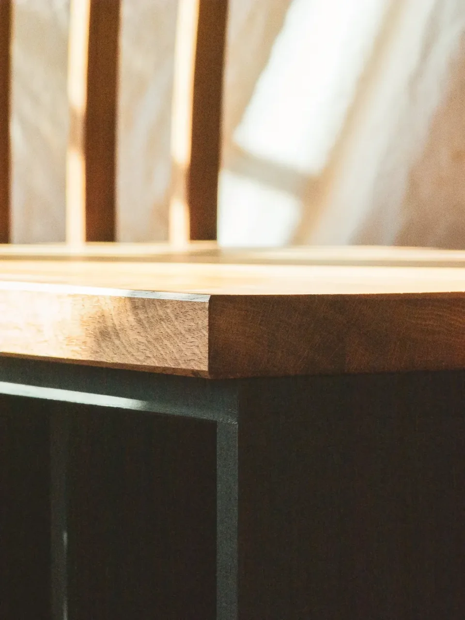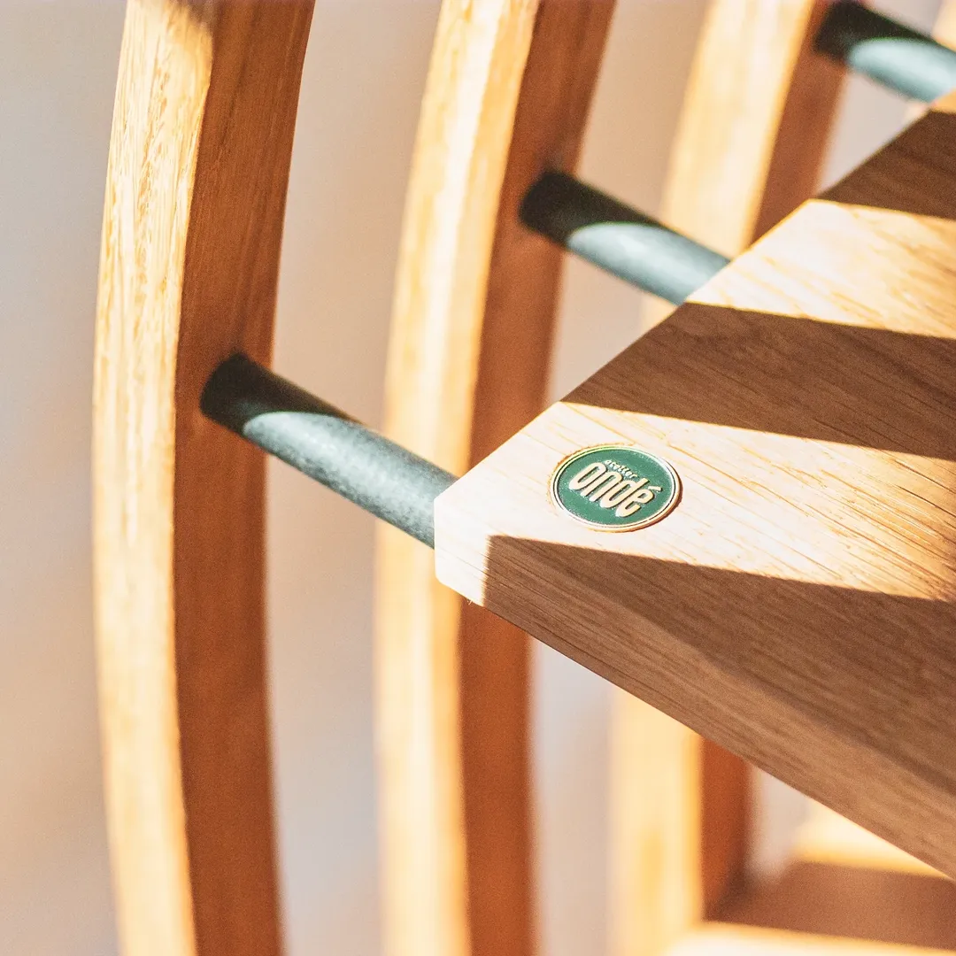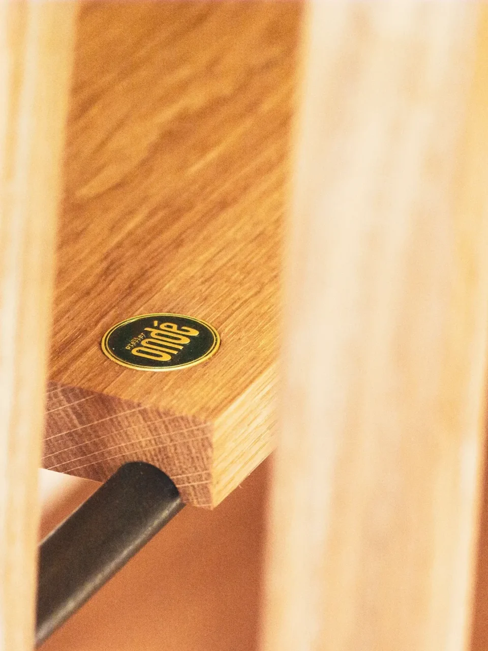 Un meuble 100% local pour une cliente locale : toutes les pièces en chêne (arcs de la barque, plateaux, piètement) ont été faites à partir d’un chêne qui a poussé et a été scié ici même, aux Crozets. Les parties noires du meuble ont été faites en latté frêne teinté noir mat.