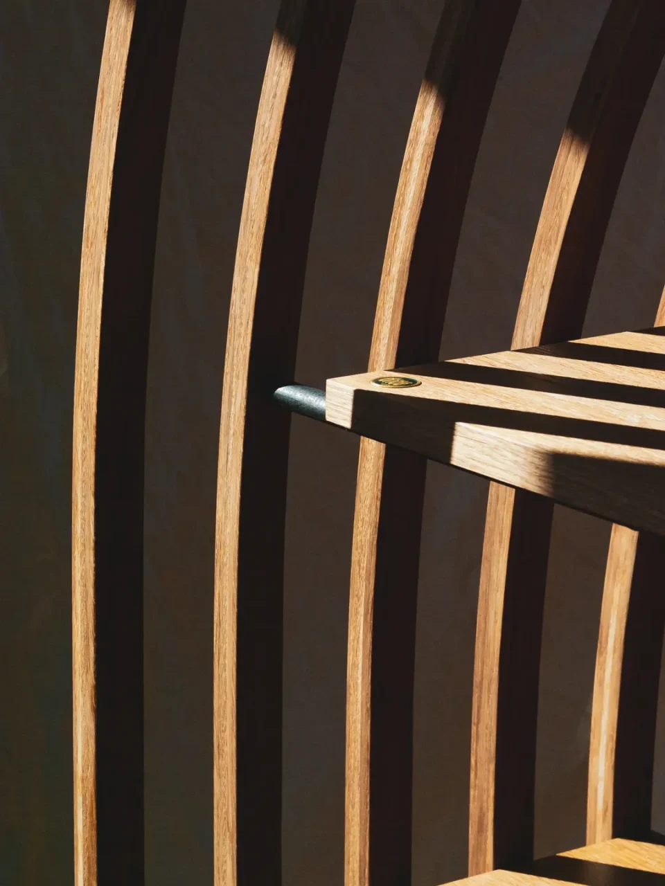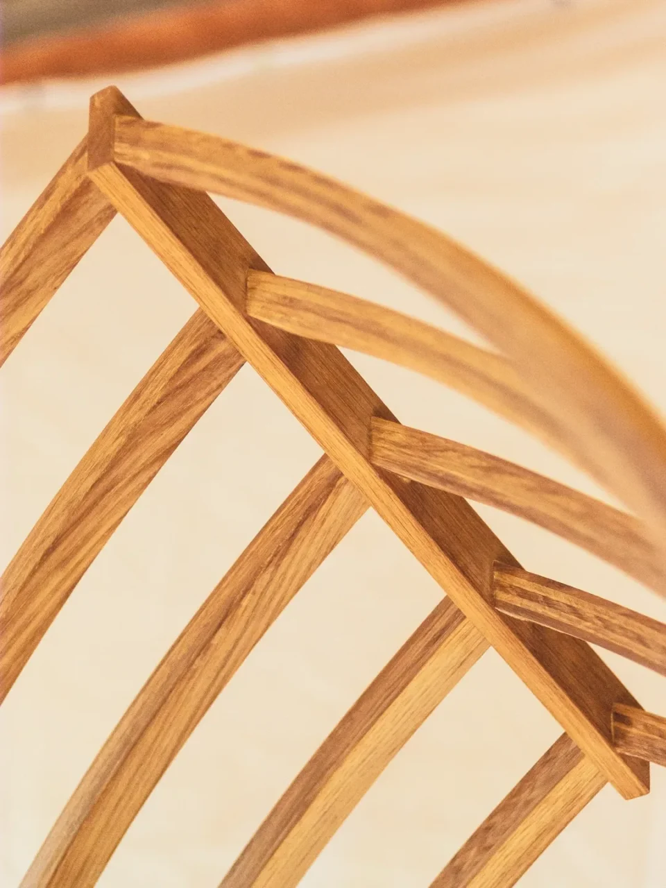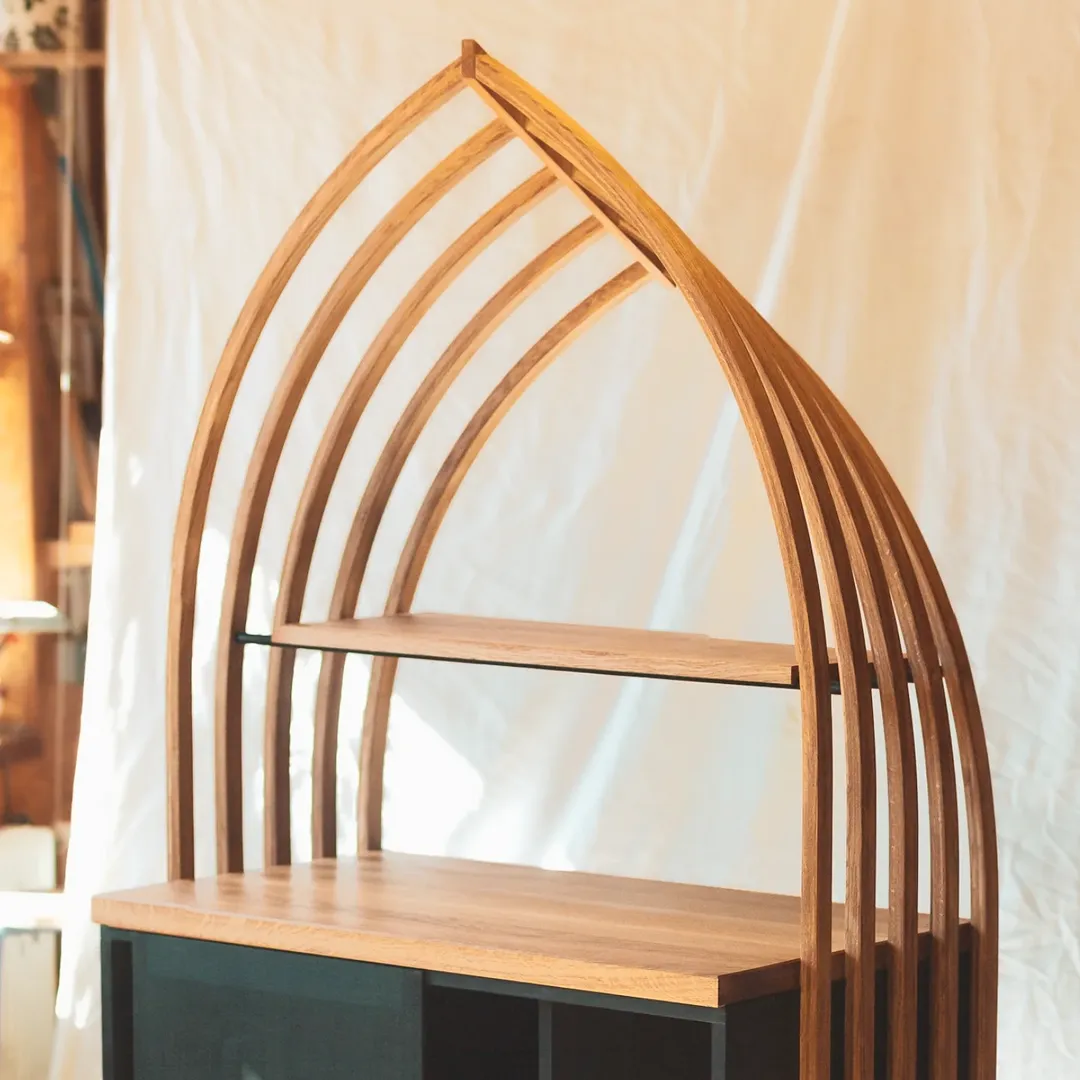 Détails des arcs de la « barque » : la partie supérieure du meuble est composée de dix arcs qui viennent se rejoindre sur « l’étrave », pièce centrale qui forme la proue de la barque. La fabrication de ces pièces fut le principal défi technique de ce projet car leur courbure doit être millimétrée pour que l’assemblage soit possible et qu’il dure dans le temps.