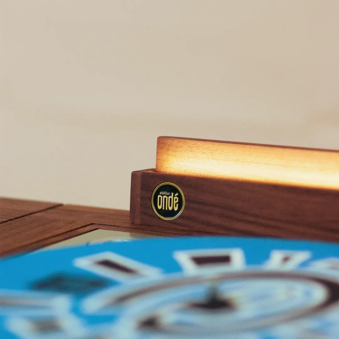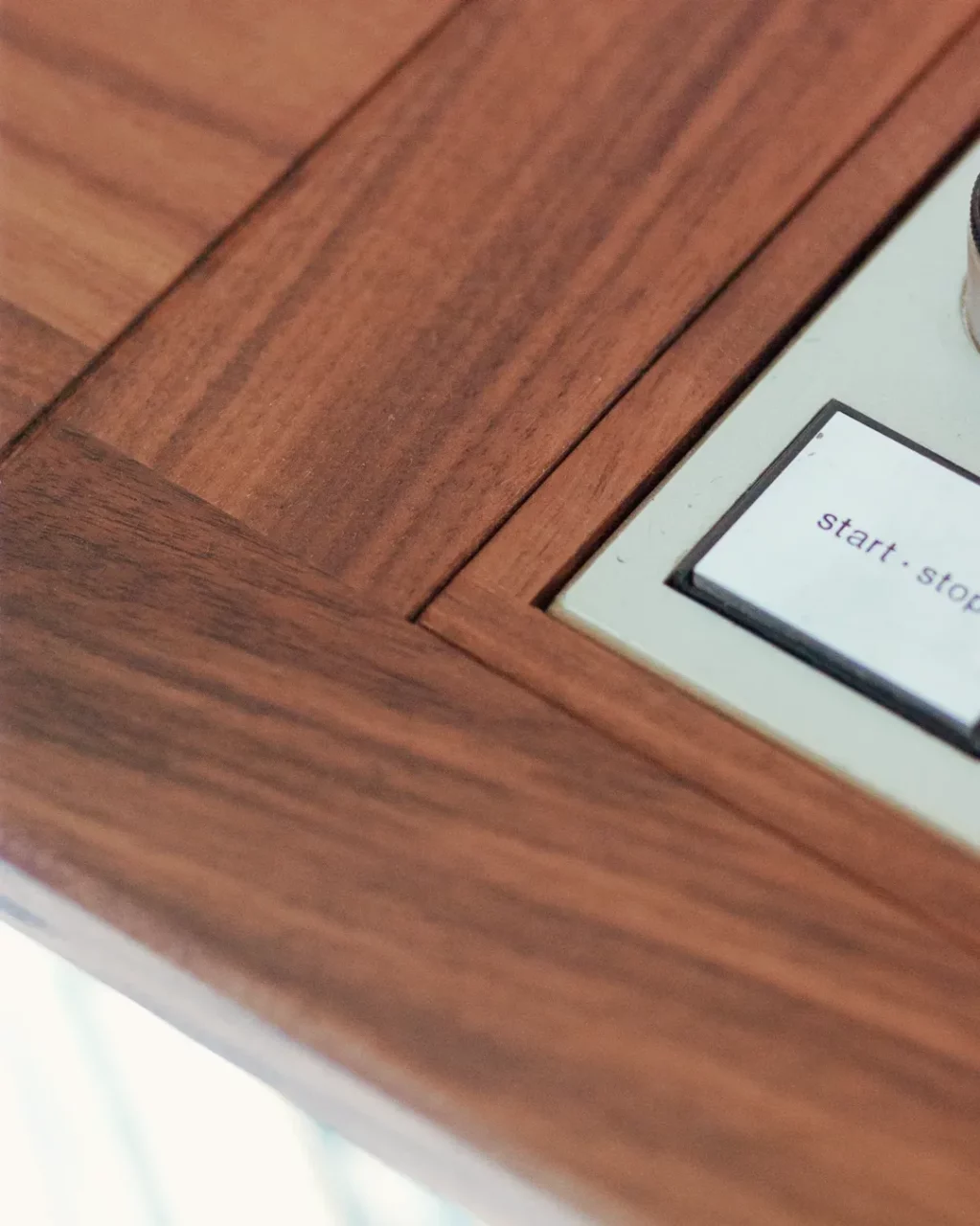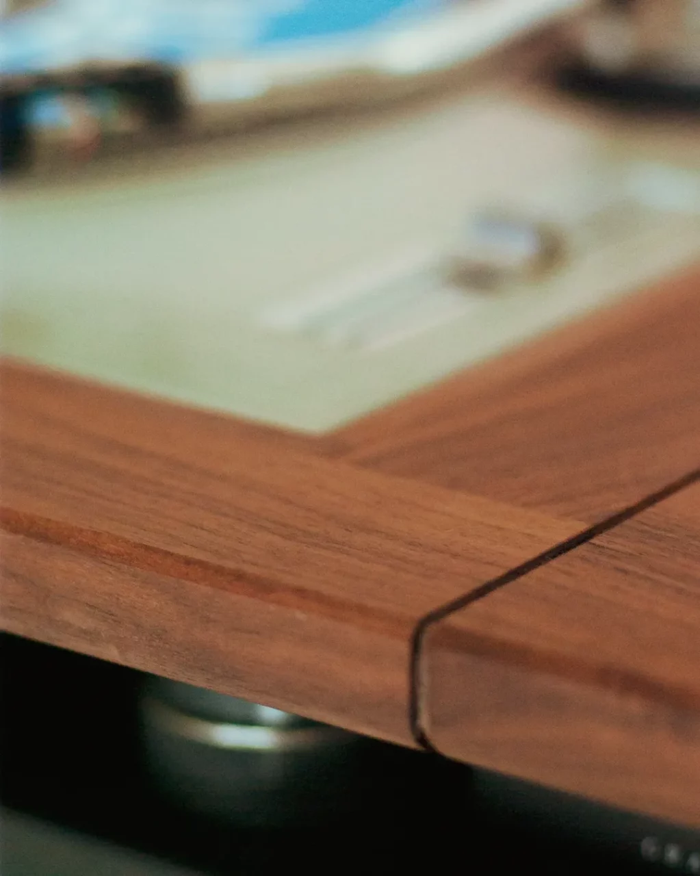 La platine est incrustée à fleur du plateau en noyer massif afin de s’intégrer naturellement au mobilier. Le cadre fin situé directement autour de la platine est interchangeable et permet d’intégrer un autre modèle de platine de dimensions différentes si le matériel audio venait à évoluer.