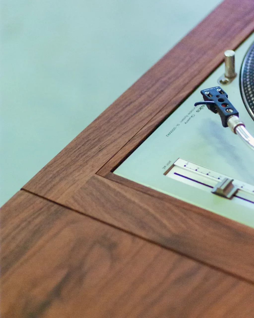Détail de l’incrustation de la Technics SL-1200 MK2 dans la console d’écoute en noyer :