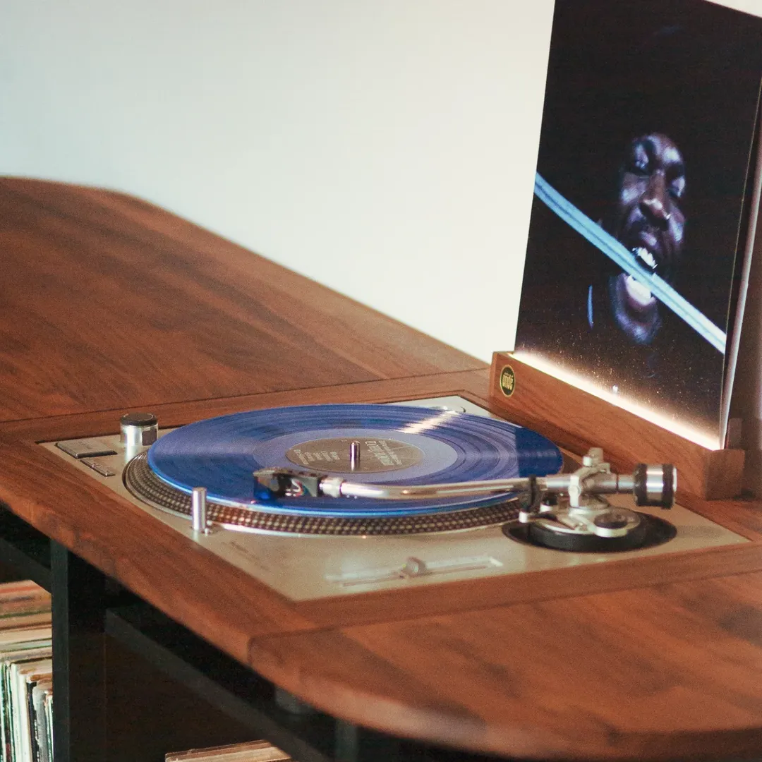 Le support est directement fixé sur le meuble et intègre lui aussi un éclairage led mettant en lumière la pochette du disque de jour comme de nuit.