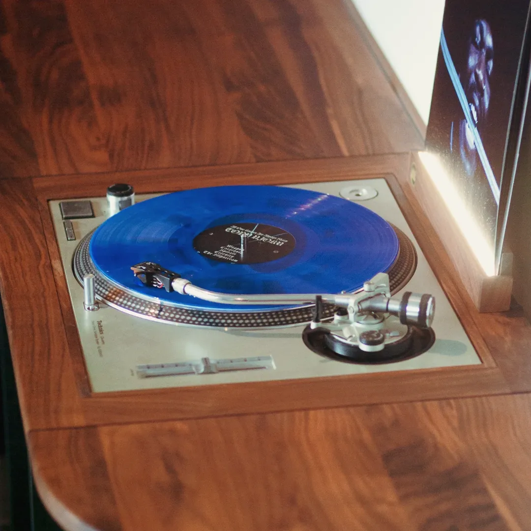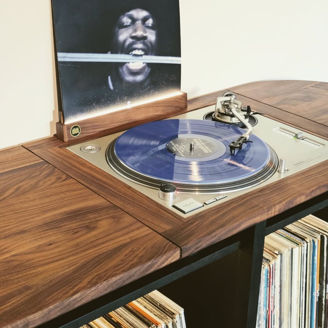 Ce projet met en scène un exemplaire de la plus célèbre des platines vinyle, la Technics SL-1200 mk2, intégrée à fleur du plateau du meuble, et est aussi équipé d’un éclairage led sur toute la longueur des rangements à vinyles. Le petit plus : un support pour la pochette du disque derrière la platine qui intègre lui aussi un éclairage led, afin de mettre en lumière la pochette du disque à l’écoute.
